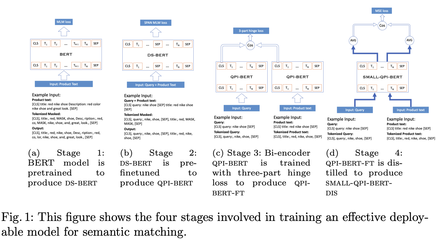 Dense 임베딩 기반 시맨틱 매칭은 철자 변형에 대한 민감도와 같은 Lexical 매칭의 단점을 해결하기 위해 이커머스 상품 검색에 널리 사용됩니다. 그러나 최근 BERT와 유사한 언어 모델 인코더의 발전은 이커머스 웹사이트에 부과된 엄격한 추론 지연 시간 요구 사항으로 인해 실시간 검색에 적용되지 못했습니다. bi-encoder BERT 아키텍처는 빠른 근사 최근접 이웃 검색을 가능하게 하지만, 학습 불안정성과 교차 인코더와의 지속적인 일반화 격차로 인해 쿼리-상품 데이터에 대해 효과적으로 학습하는 것은 여전히 어려운 과제입니다. 이 연구에서는 추론 지연 시간을 낮추면서 상품 검색에 대규모 BERT와 유사한 모델을 활용할 수 있는 4단계 훈련 절차를 제안합니다. 쿼리-상품 상호 작용 사전 미세 조정을 도입하여 BERT 바이 인코더를 효과적으로 사전 훈련하여 매칭하고 일반화를 개선합니다. 이커머스 상품 데이터 셋에 대한 오프라인 실험을 통해, 저희의 접근 방식을 사용해 훈련된 소규모 BERT 기반 모델(7500만 개의 매개변수)이 유사한 추론 지연 시간을 가진 기준 DSSM 기반 모델보다 검색 관련성 지표를 최대 23%까지 향상시킨다는 것을 보여주었습니다. 소형 모델은 20배 더 큰 교사와 비교했을 때 관련성 지표가 3%만 감소합니다. 또한 대규모 온라인 A/B 테스트를 통해 정확한 상품과 대체 상품 검색에서 프로덕션 모델보다 개선된 접근 방식을 보여주었습니다.