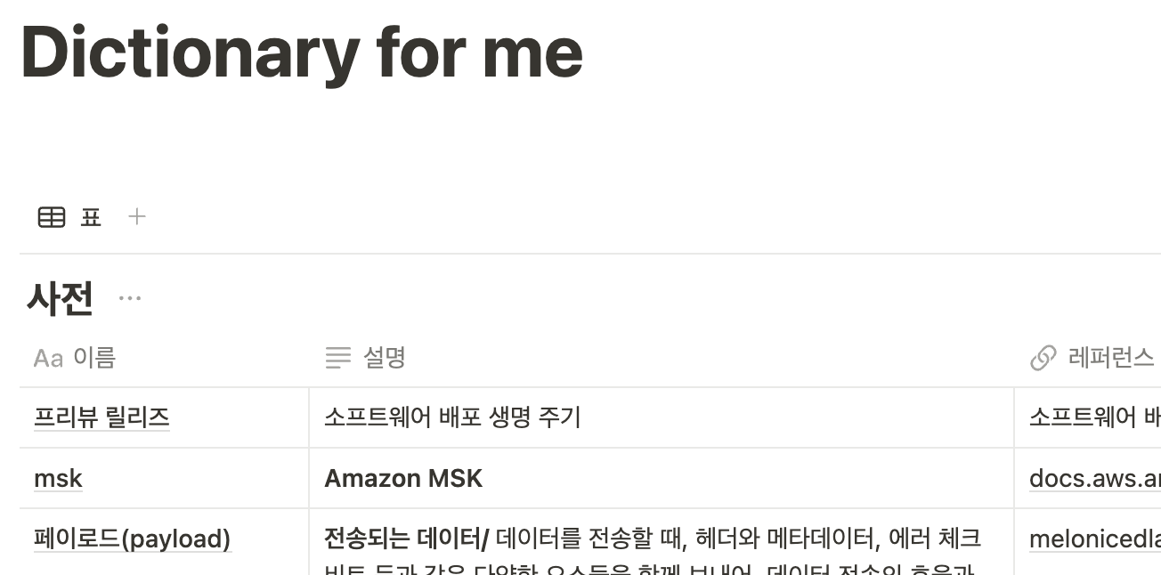 이 외에도, 개인적으로 가장 의미 있었던 기록은 노션에 정리한 [Dictionary for me] 페이지였습니다. 데이터 직군이 아닌 백엔드 팀에서 신입 생활을 시작한 것은 쉽지 않았습니다. "API가 뭐예요?" 수준이었던 저에게, 회의에서 들리는 생소한 용어들은 하나의 장벽과도 같았습니다. 그래서 모르는 용어는 전부 적어두고 하나씩 공부해 나갔습니다. 부끄럽지만, 이 사전 덕분에 빠르게 성장할 수 있었습니다. 물론, 공부를 했어도 100% 이해하지는 못했지만요… 😅