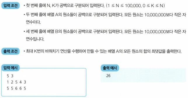 동빈이는 최대 K번의 바꿔치기 연산을 수행할 수 있는데, 바꿔치기 연산이란 배열 A에 있는 원소 하나와 배열 B에 있는 원소 하나를 골라서 두 원소를 서로 바꾸는 것을 말한다.