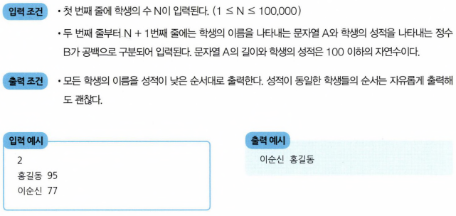 실전문제 성적이 낮은 순서로 학생 출력하기 N명의 학생 정보가 있다. 학생 정보는 학생의 이름과 학생의 성적으로 구분된다. 각 학생의 이름과 성적 정보가 주어졌을 때 성적이 낮은 순서대로 학생의 이름을 출력하는 프로그램을 작성하시오. 나의 풀이 n = int(input()) name_score = [] for i in range(n): name, score = input().split() name_score.append([name,int(score)]) name_score = sorted(name_score, key = lambda x: x[1]) for i in range(n): print(name_score[i][0], end = ' ') ​ - 처음에 성적인 것 보고 계수 정렬 쓰려고 했다가 안되는..