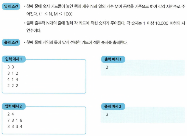 실전문제 숫자 카드 게임 숫자 카드 게임은 여러 개의 숫자 카드 중에서 가장 높은 숫자가 쓰인 카드 한 장을 뽑는 게임이다. 단, 게임의 룰을 지키며 카드를 뽑아야 하고 룰은 다음과 같다. 숫자가 쓰인 카드들이 N x M 형태로 놓여 있다. 이때 N은 행의 개수를 의미하며, M은 열의 개수를 의미한다. 먼저 뽑고자 하는 카드가 포함되어 있는 행을 선택한다. 그다음 선택된 행에 포함된 카드들 중 가장 숫자가 낮은 카드를 뽑아야 한다. 따라서 처음에 카드를 골라낼 행을 선택할 때, 이후에 해당 행에서 가장 숫자가 낮은 카드를 뽑을 것을 고려하여 최종적으로 가장 높은 숫자의 카드를 뽑을 수 있도록 전략을 세워야 한다. 카드들이 N x M 형태로 놓여 있을 때, 게임의 룰에 맞게 카드를 뽑는 프로그램을 만드시오..