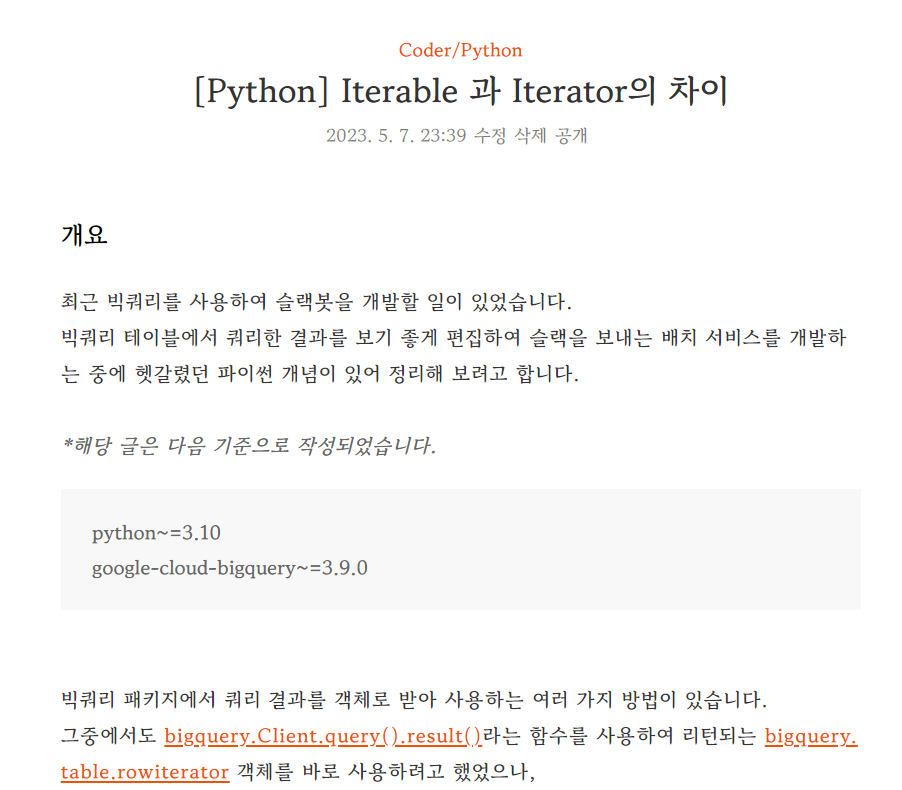 개요 최근 빅쿼리를 사용하여 슬랙봇을 개발할 일이 있었습니다. 빅쿼리 테이블에서 쿼리한 결과를 보기 좋게 편집하여 슬랙을 보내는 배치 서비스를 개발하는 중에 헷갈렸던 파이썬 개념이 있어 정리해 보려고 합니다. *해당 글은 다음 기준으로 작성되었습니다. python~=3.10 google-cloud-bigquery~=3.9.0 빅쿼리 패키지에서 쿼리 결과를 객체로 받아 사용하는 여러 가지 방법이 있습니다. 그중에서도 bigquery.Client.query().result()라는 함수를 사용하여 리턴되는 bigquery.table.rowiterator 객체를 바로 사용하려고 했었으나, for문 실행 중에 ‘iterator has already started'라는 오류가 발생하였습니다. 😭 파이썬의 기본 개념..